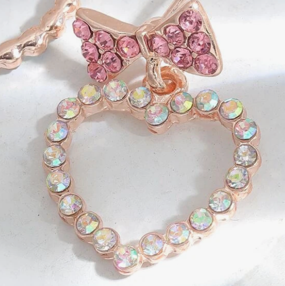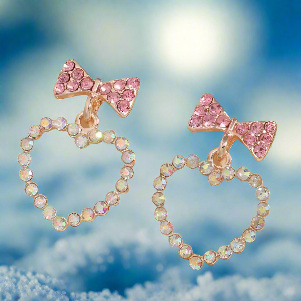 These sweet Bow Love Earrings dance with sparkle as they dangle from your ears and are sure to grab attention. They're sprinkled with pink and clear rhinestones. They're lightweight and won't weigh down delicate lobes.