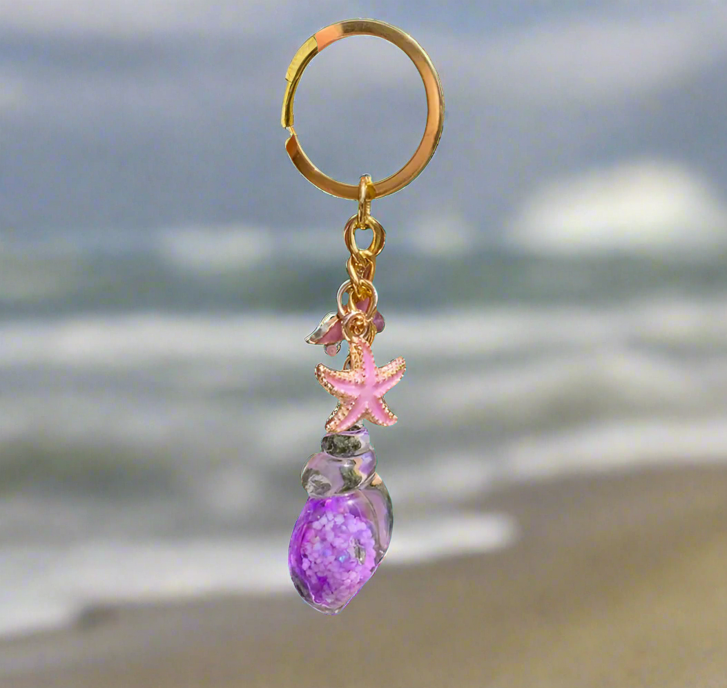 This pretty Shell Keychain is special whether it's day or night because it has a magical quality: crystals inside the shell glow in the dark! Inside the acrylic shell is a tiny seashell nestled in the crystals. Available color: lavender crystals inside shell. Actual keychain appearance may vary, as each one is handmade and unique.