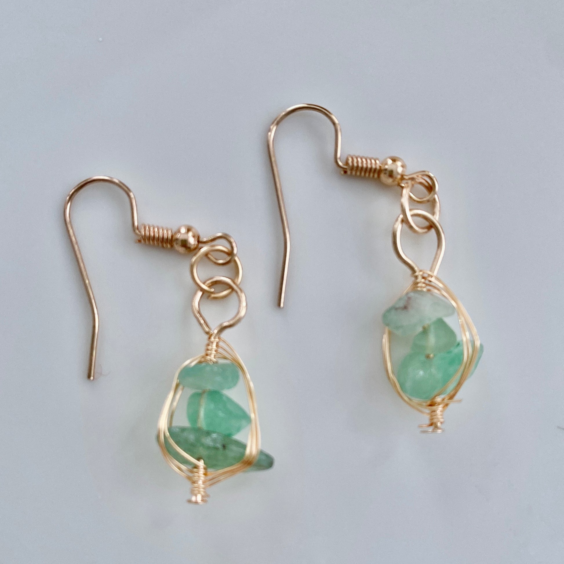 These beautiful Green Sea Stone Earrings for pierced ears by Lemonade Mermaid evoke the beauty of the emerald sea with three natural shaped stones delicately captured in gold-colored strands. They are lightweight so they won't stretch your delicate lobes.