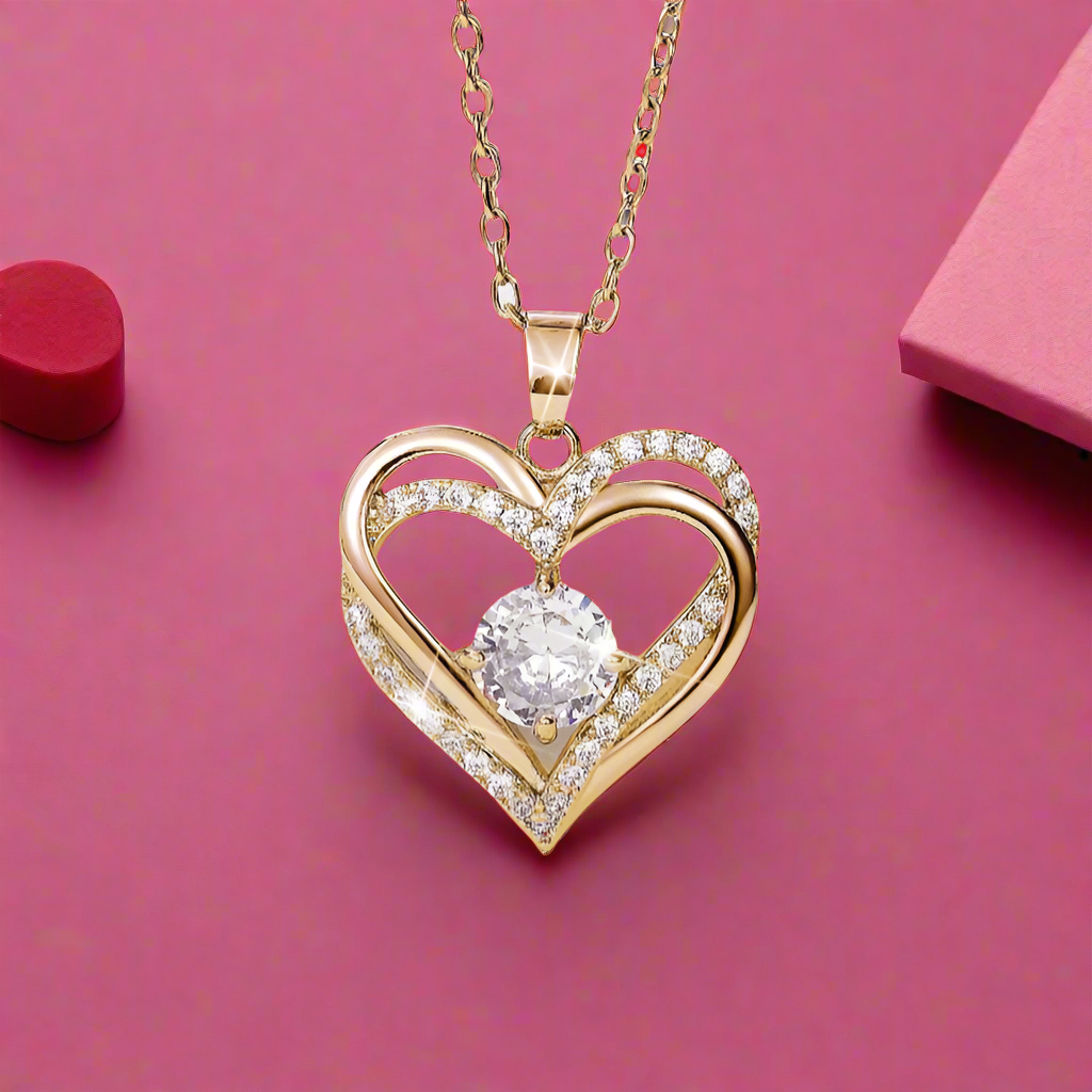 Make a statement with this sparkling beauty! Our True Heart Necklace features cubic zirconia stones adorning two interwoven double gold hearts dangling from a lightweight pendant.