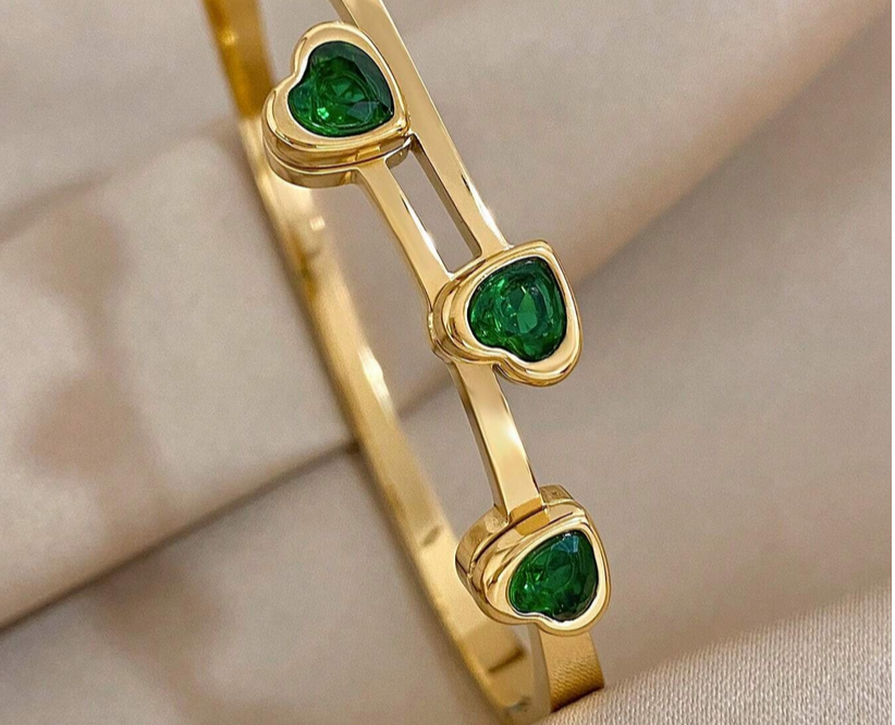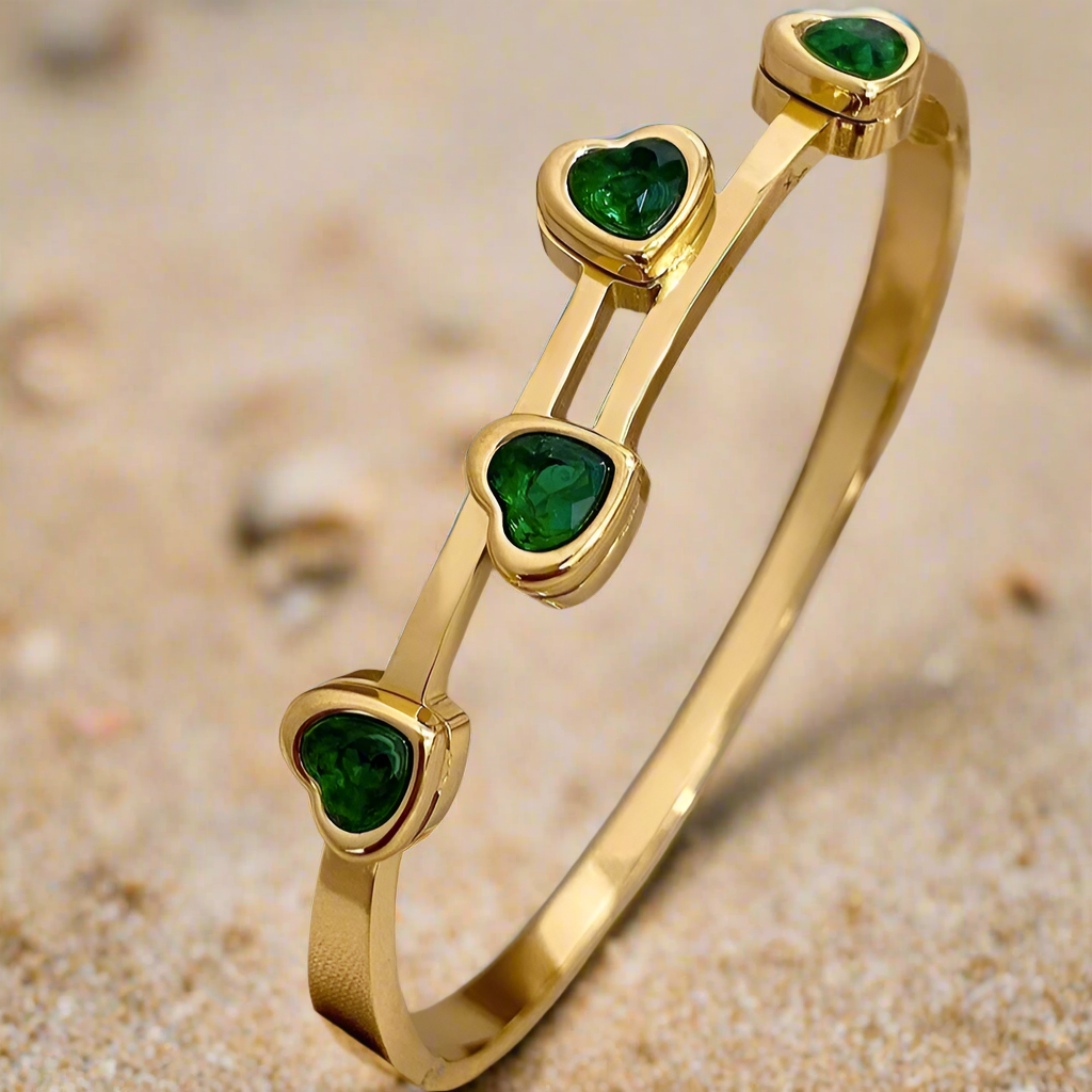 Four emerald green hearts adorn this beautiful, elegant, gold-colored Mermaid Heart Bracelet with cubic zirconia accents. She'll love it! It hinges open and snaps shut to fit most wrists. Delivered in beautiful gift packaging.