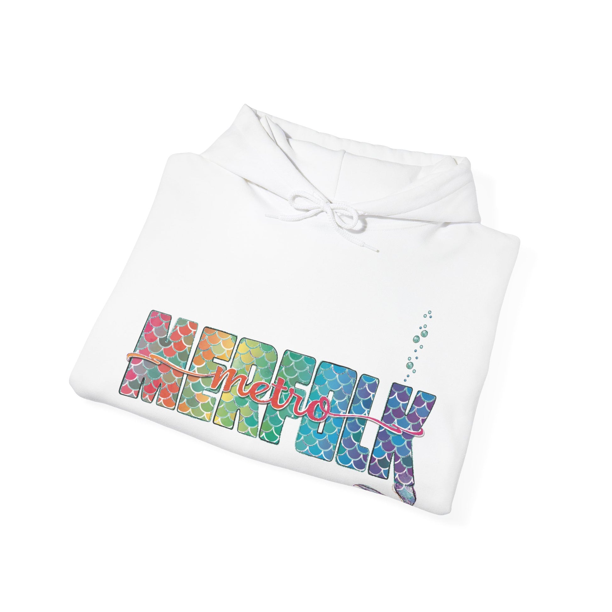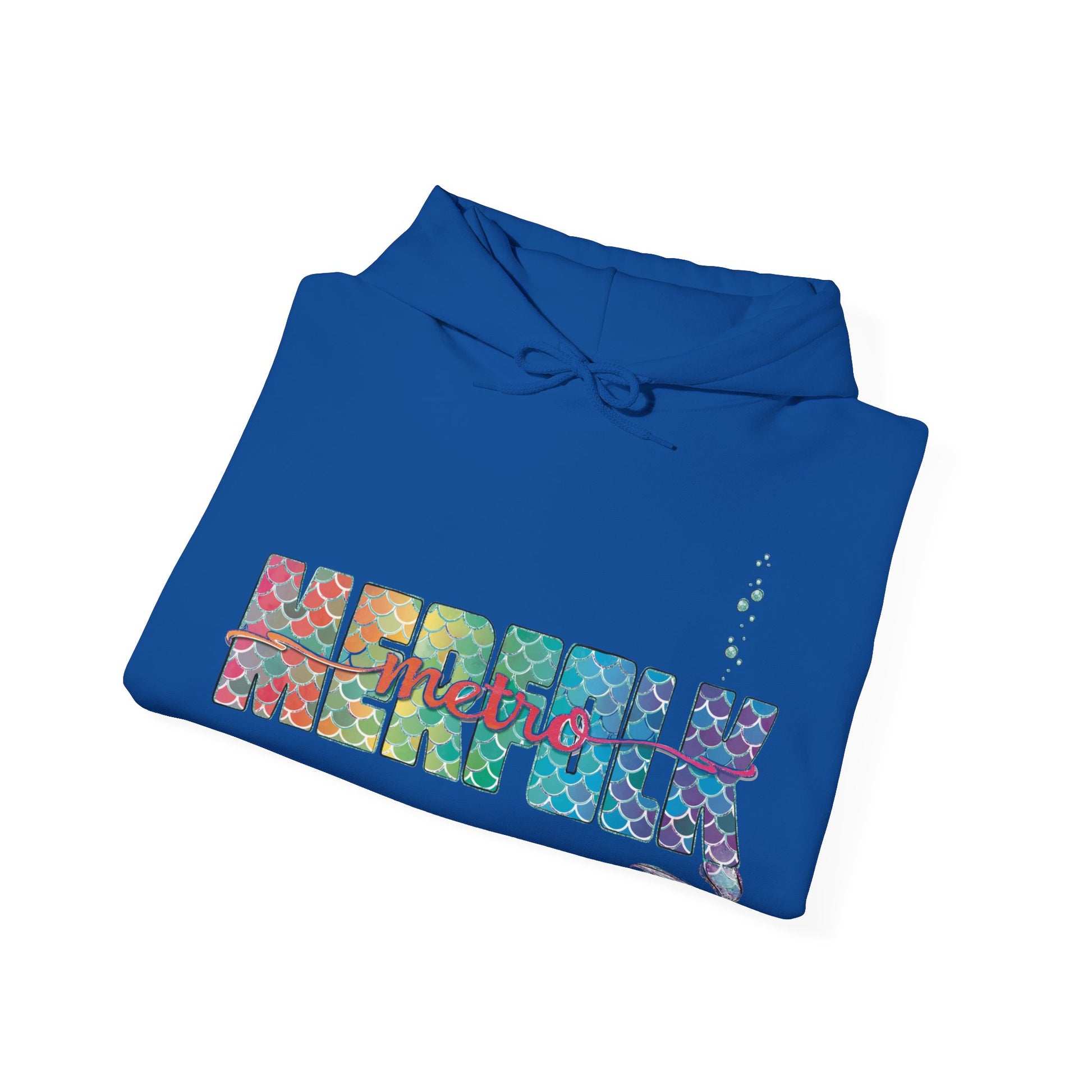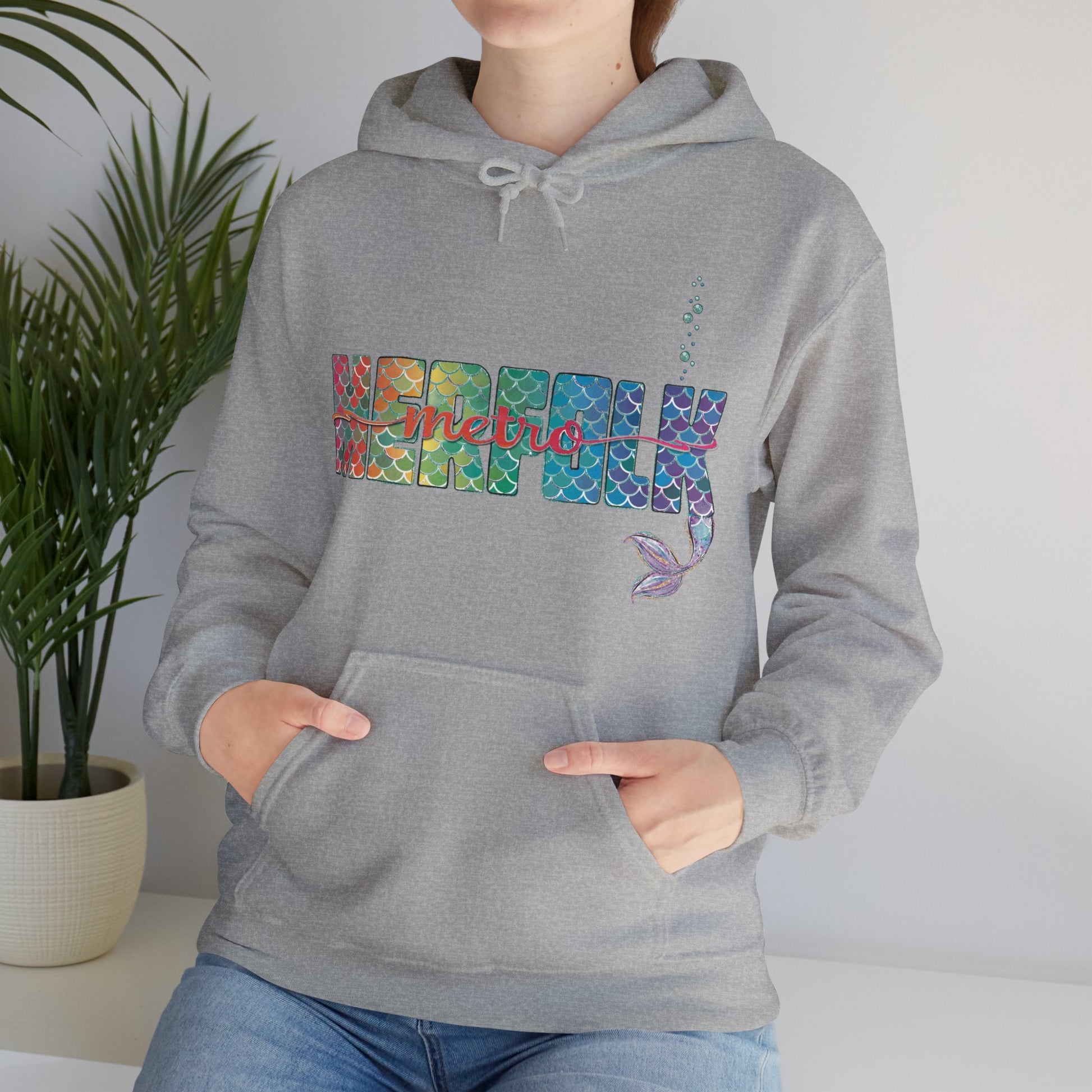 Rep the largest mermaid pod in the DMV with this Metro Merfolk hoodie! Metro Merfolk is a pod of professional and hobbiest mermaids who meet up for swims, classes, and events. Everyone is welcome to join, even if you're brand new. Want to learn more? Check out www.metromerfolk.com