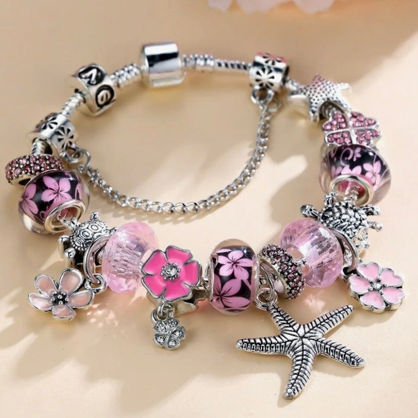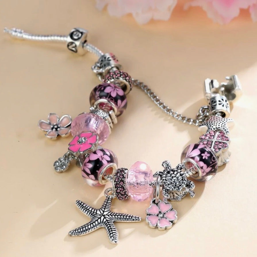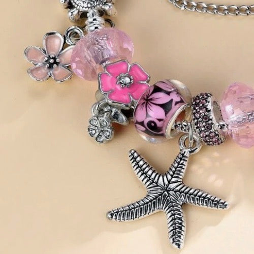 More than a dozen beads and charms featuring pretty pink adorn this silver-colored Pink Sea Flowers Bracelet. Hearts, flowers, starfish, turtles, and more!