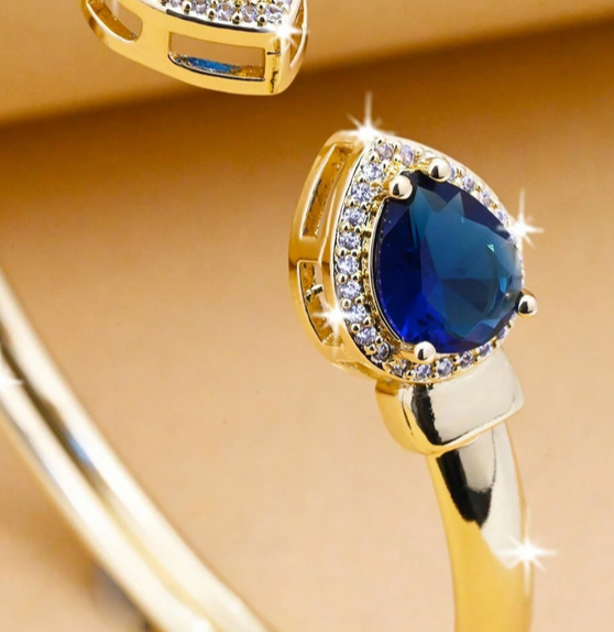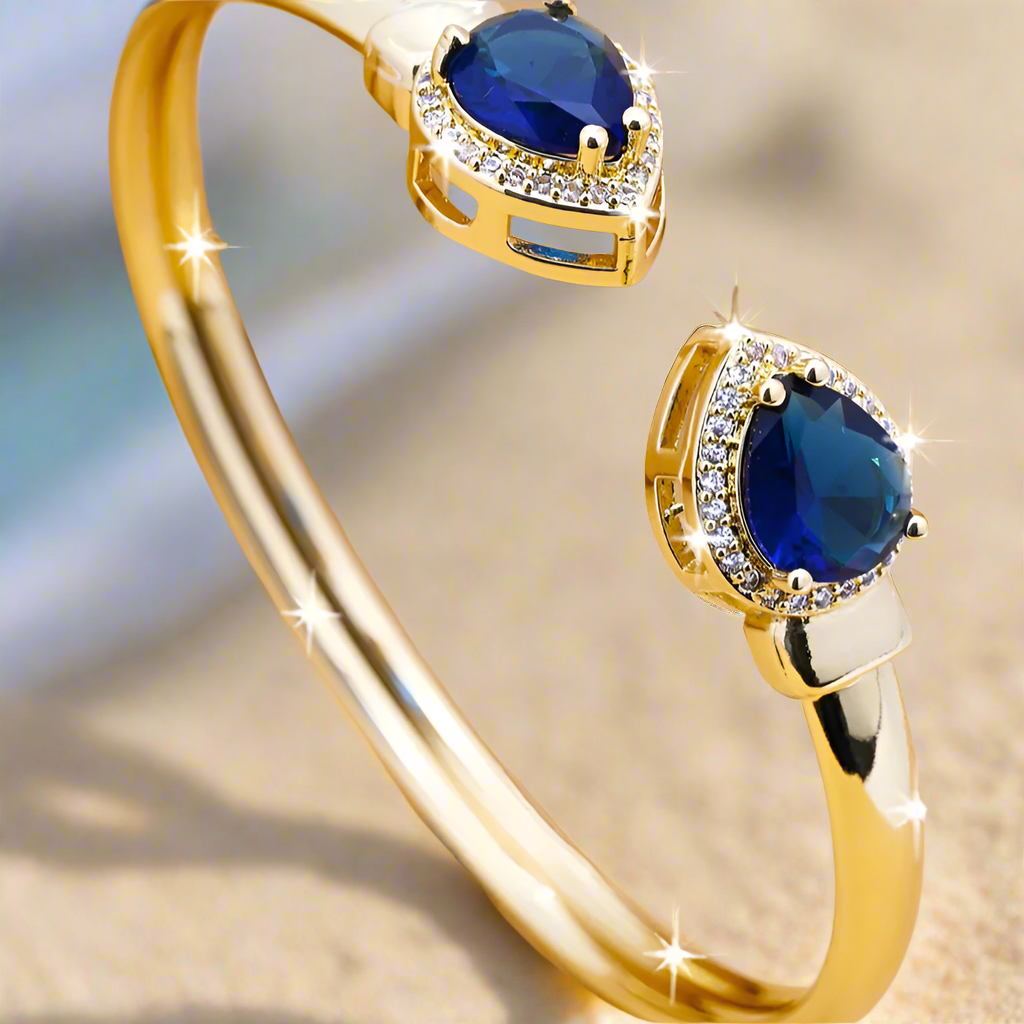 Our Sapphire Ocean Bracelet is elegant and upscale-looking, yet surprisingly lightweight and comfortable. Two teardrop shaped rhinestones are surrounded by sparkling faux diamonds in a beautiful gold-colored setting. The band is flexible and twists gently to place on your wrist.