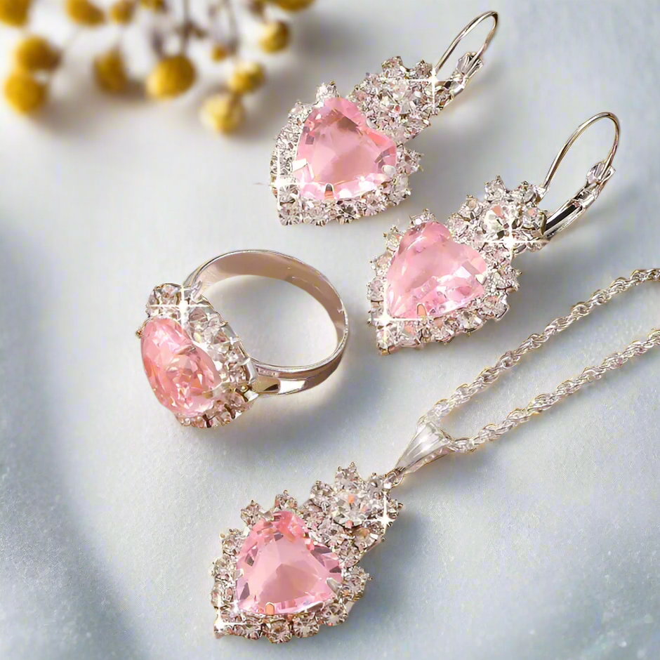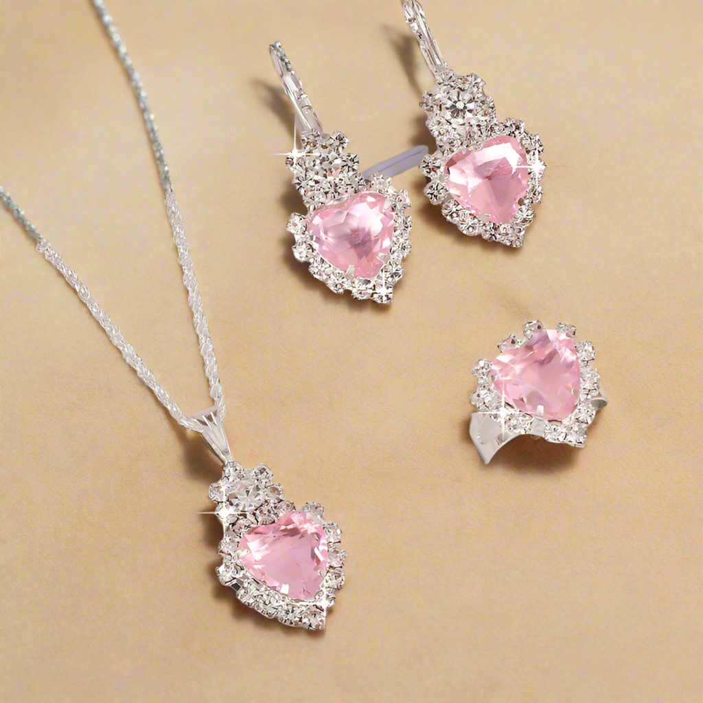 Stunning earrings, necklace, and a ring are included in this pretty pink Princess Heart Jewelry Set. The heart-shaped rhinestones are surrounded by a generous collection of sparkling rhinestones all on silver backdrops. Each heart charm is a standout, measuring approx. 1.4" tall x .7" wide. All pieces are lightweight. She'll love them!