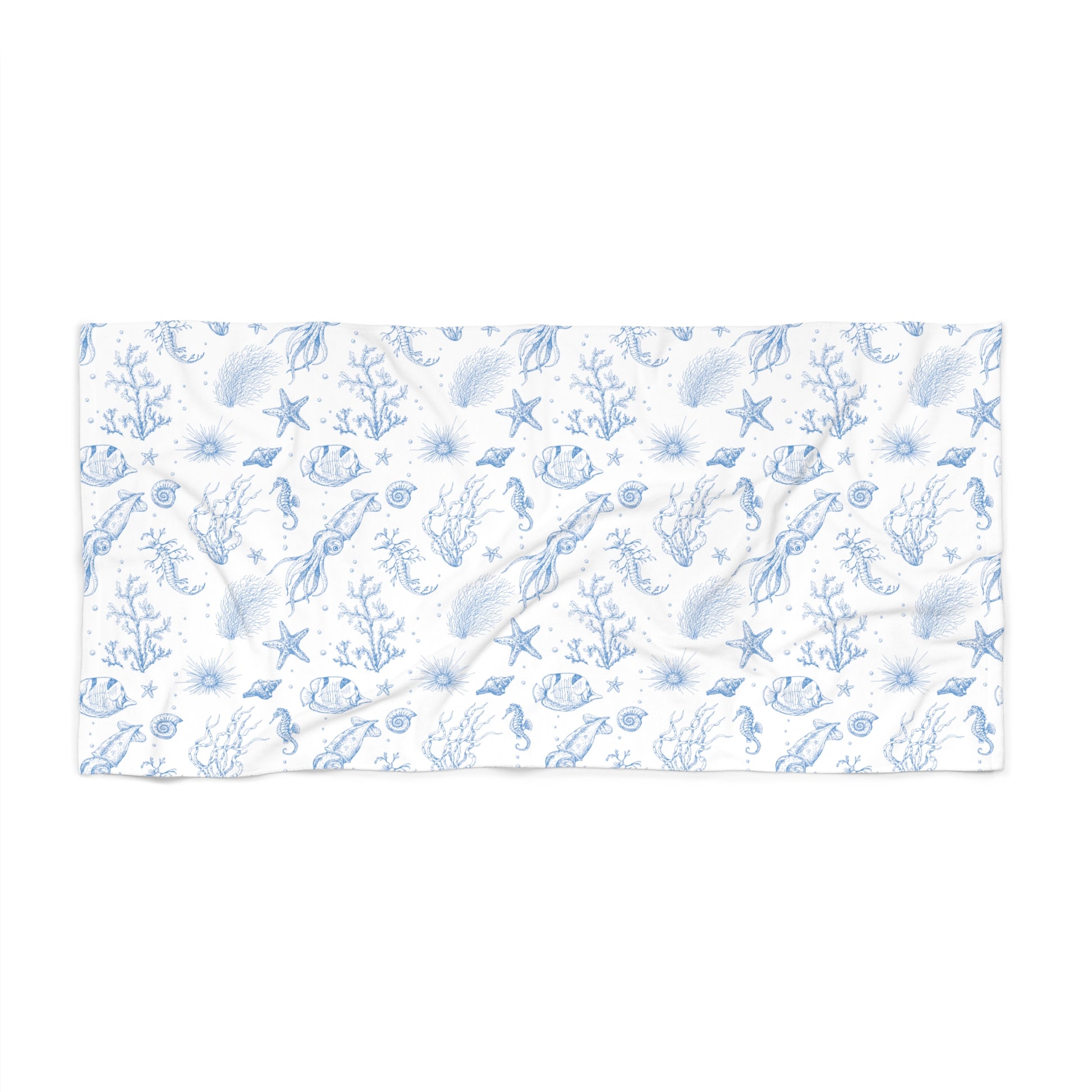 A perfect companion to the rest of our "Under the Sea" collection! This large 2 1/2' by 5' beach towel features our adorable sea critters in beautiful ocean blue with white background. It will keep you high and dry after your ocean or pool adventures, or after. your bath. Lightweight and dries fast!