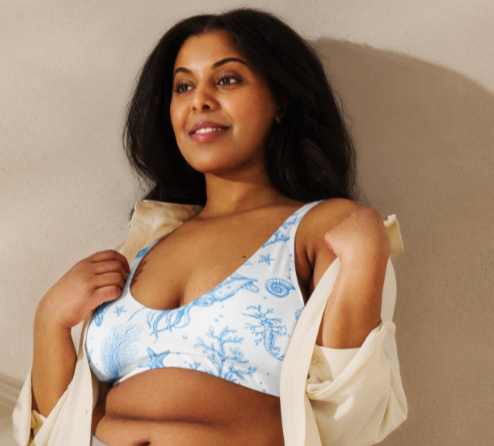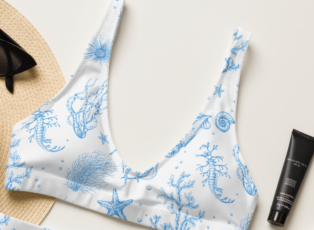 This flattering bikini top is sold separately: perfect for someone who is one size on top and another on the bottom! Double-layered so it's not too thin, yet it's always comfy! Comes with removable padding. Our "Under the Sea" design is with your favorite sea critters in sky blue floating on a dreamy white background. Designed by The Lemonade Mermaid, inspired by the blues and whites of Santorini. Featuring squid, coral, starfish, seahorses, angelfish, urchins and more!