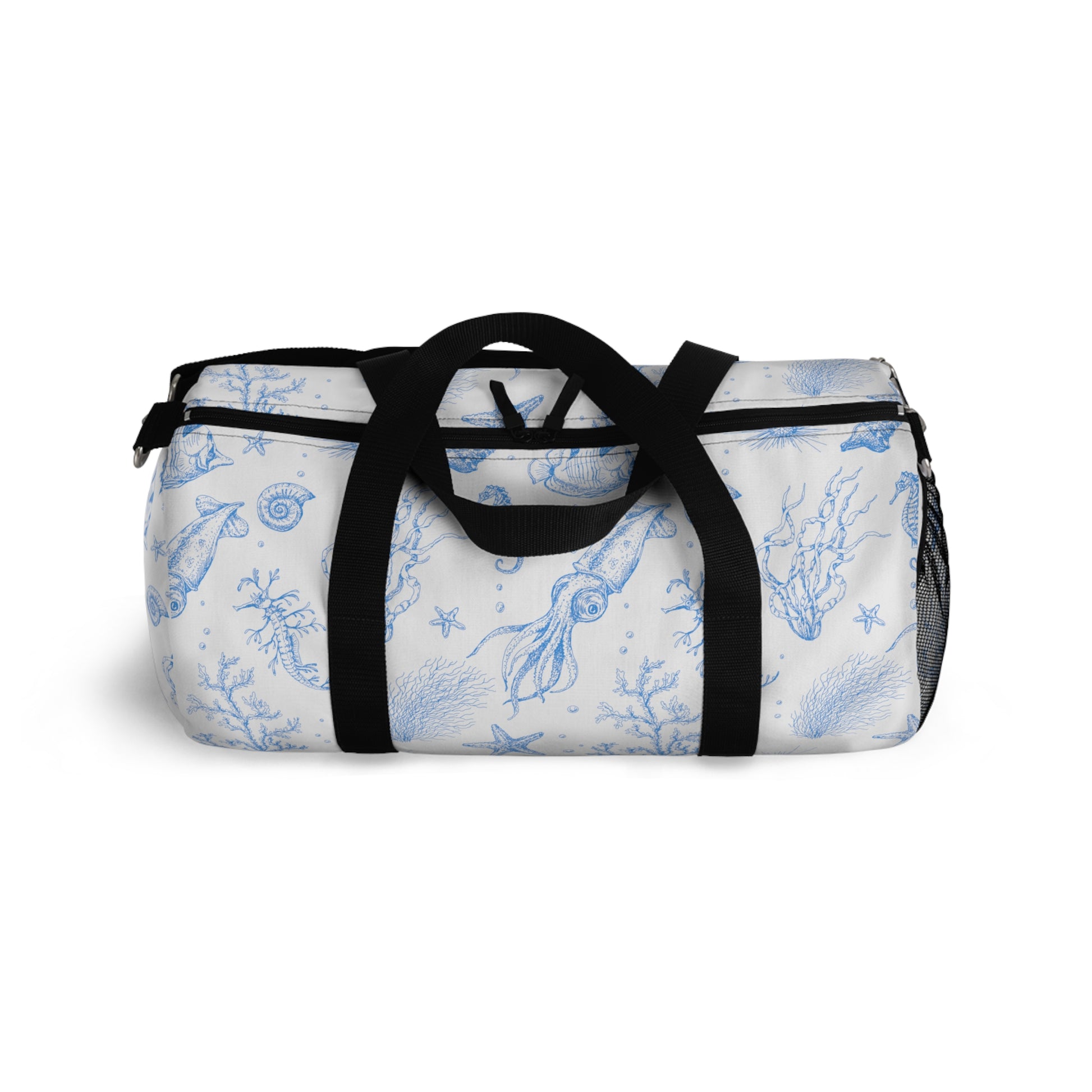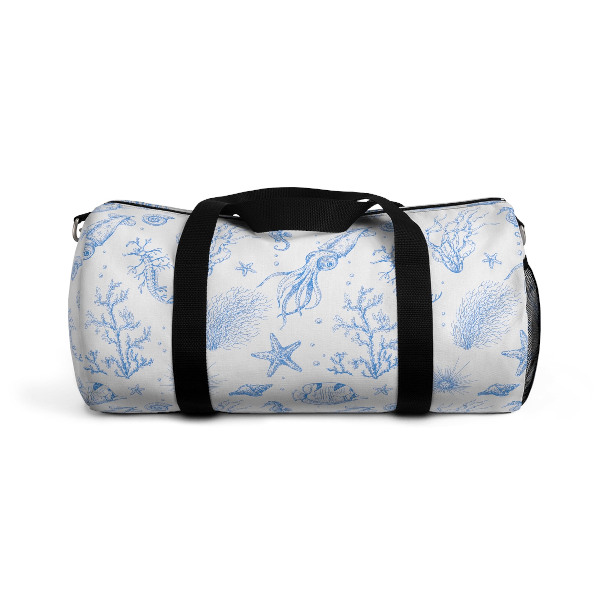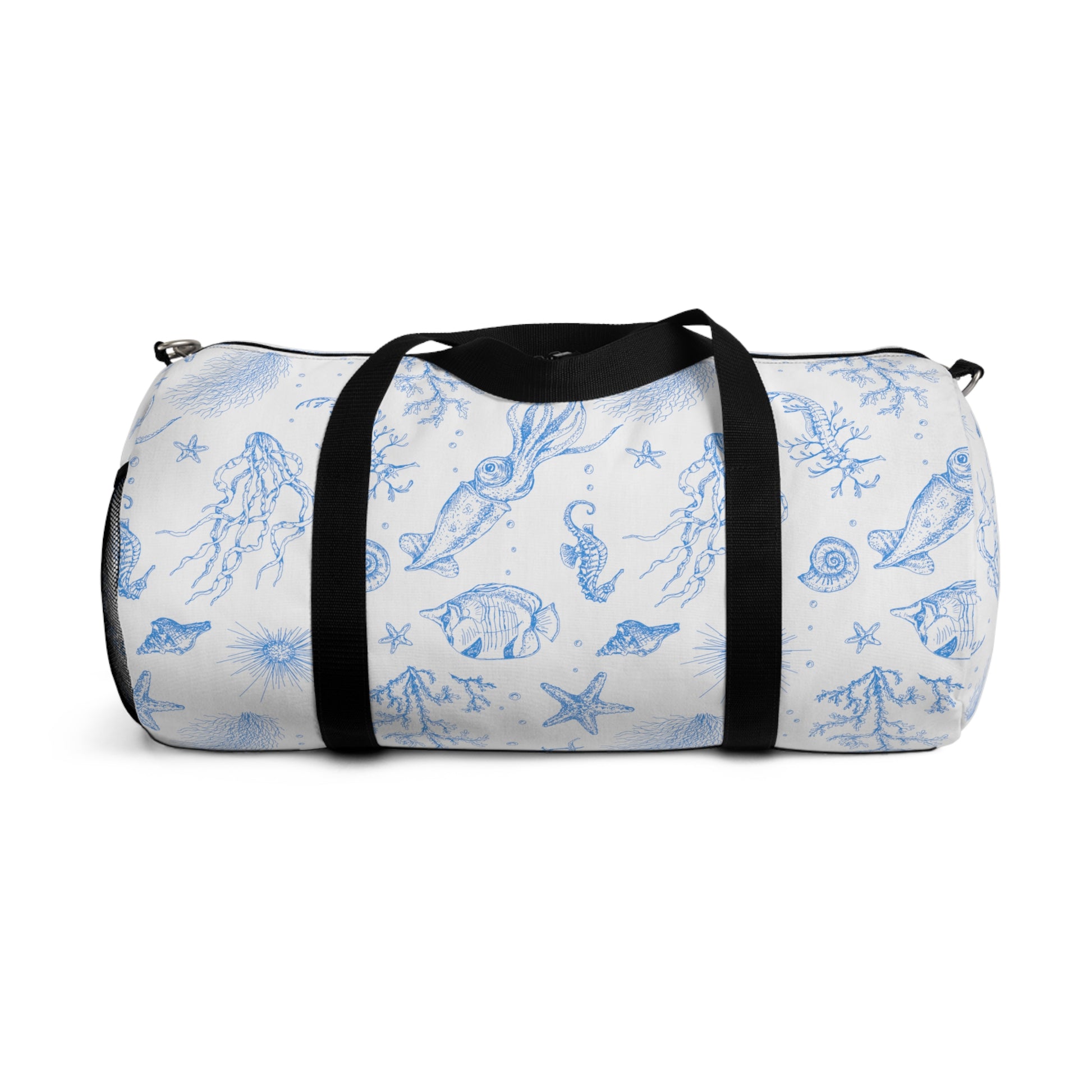 Take the sea with you in our durable, convenient, canvas"Under the Sea" duffel bag with your favorite sea critters in sky blue floating on a dreamy white background. Designed by The Lemonade Mermaid, inspired by the blues and whites of Santorini. Featuring squid, coral, starfish, seahorses, angelfish, urchins and more!featuring squid, starfish, and coral. Adjustable strap and two sizes available!