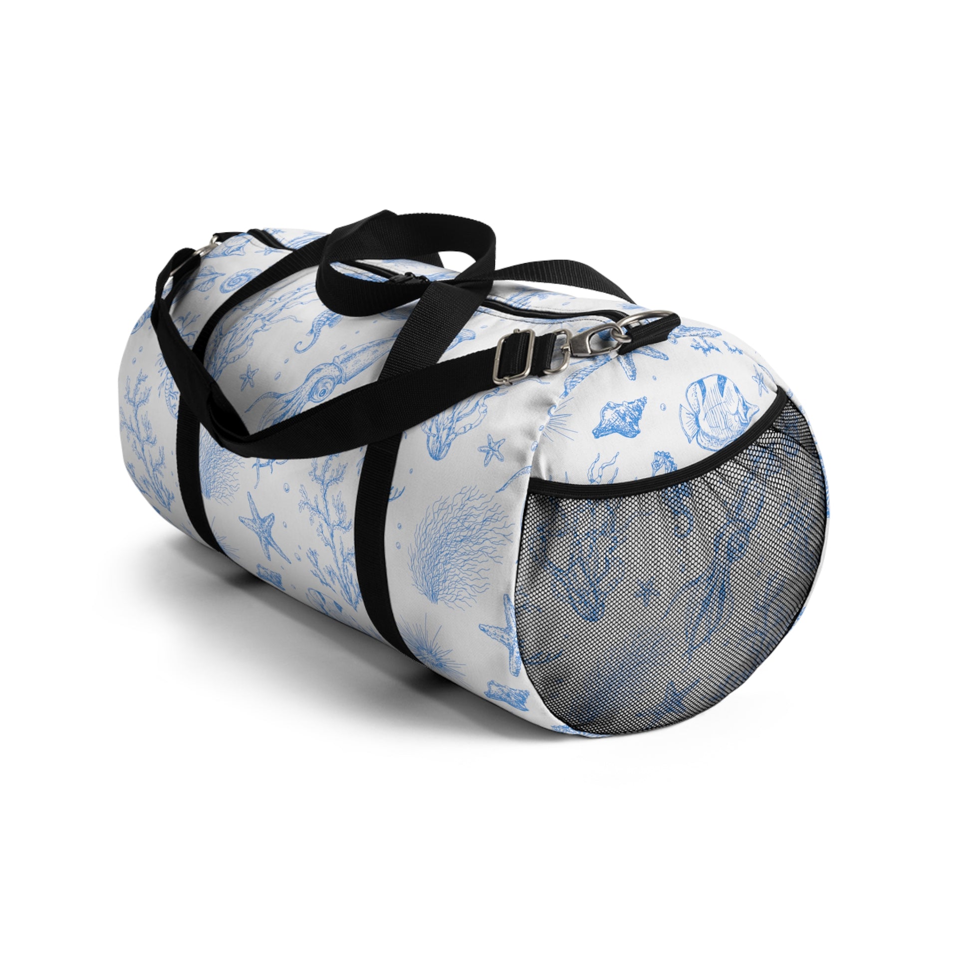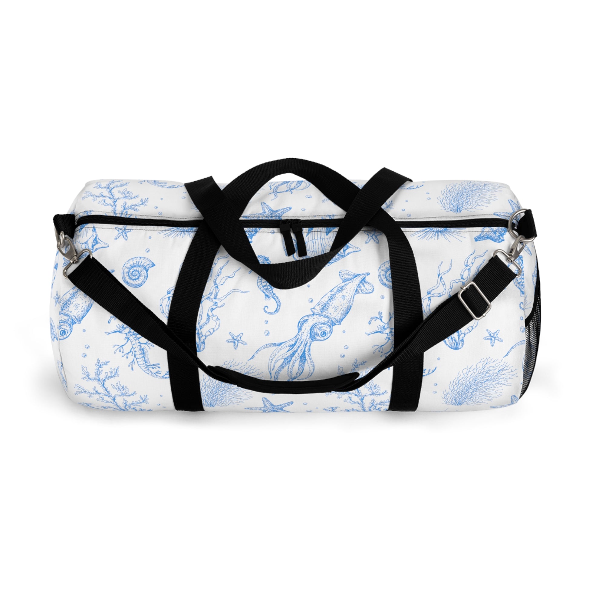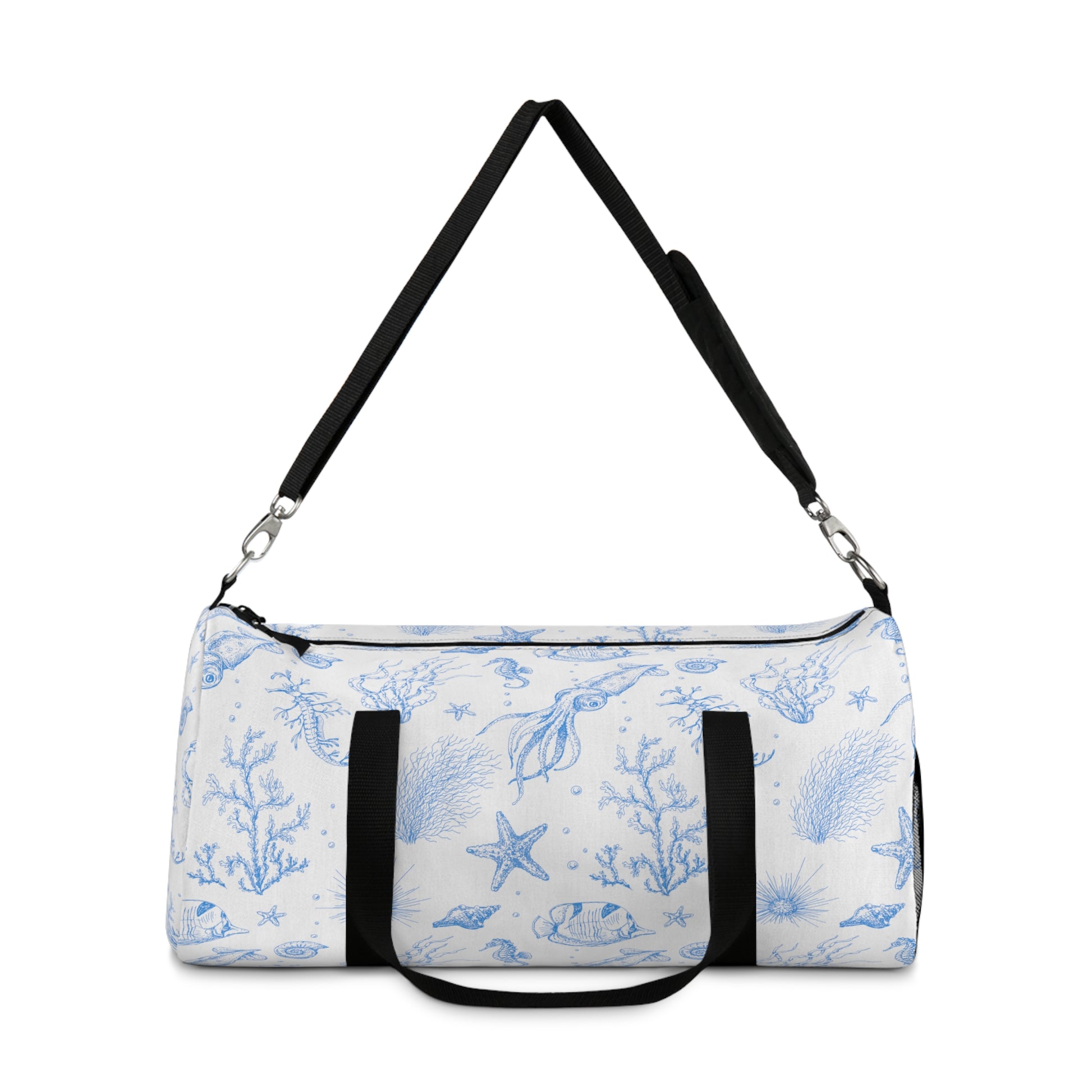 Take the sea with you in our durable, convenient, canvas"Under the Sea" duffel bag with your favorite sea critters in sky blue floating on a dreamy white background. Designed by The Lemonade Mermaid, inspired by the blues and whites of Santorini. Featuring squid, coral, starfish, seahorses, angelfish, urchins and more!featuring squid, starfish, and coral. Adjustable strap and two sizes available!