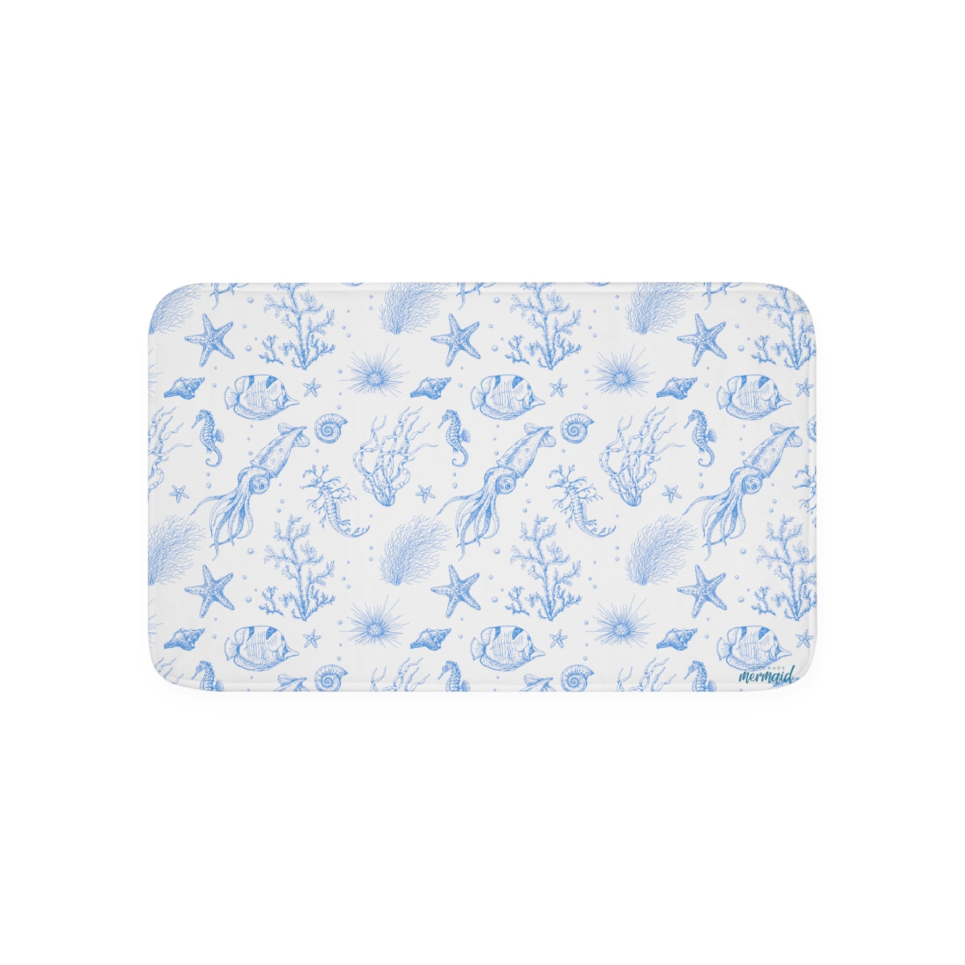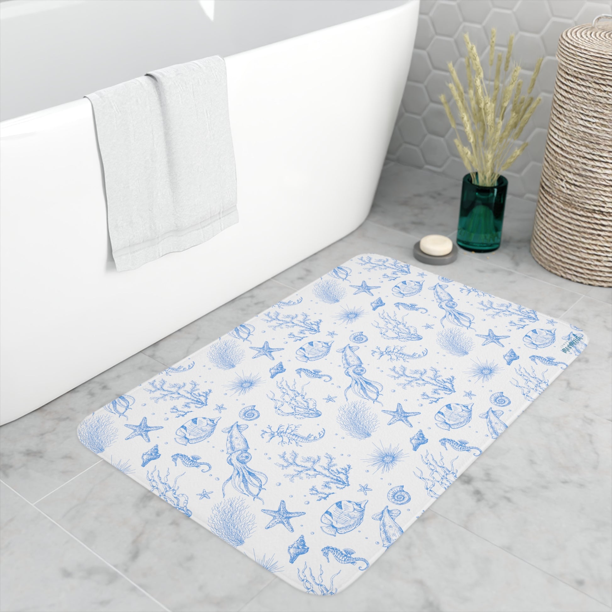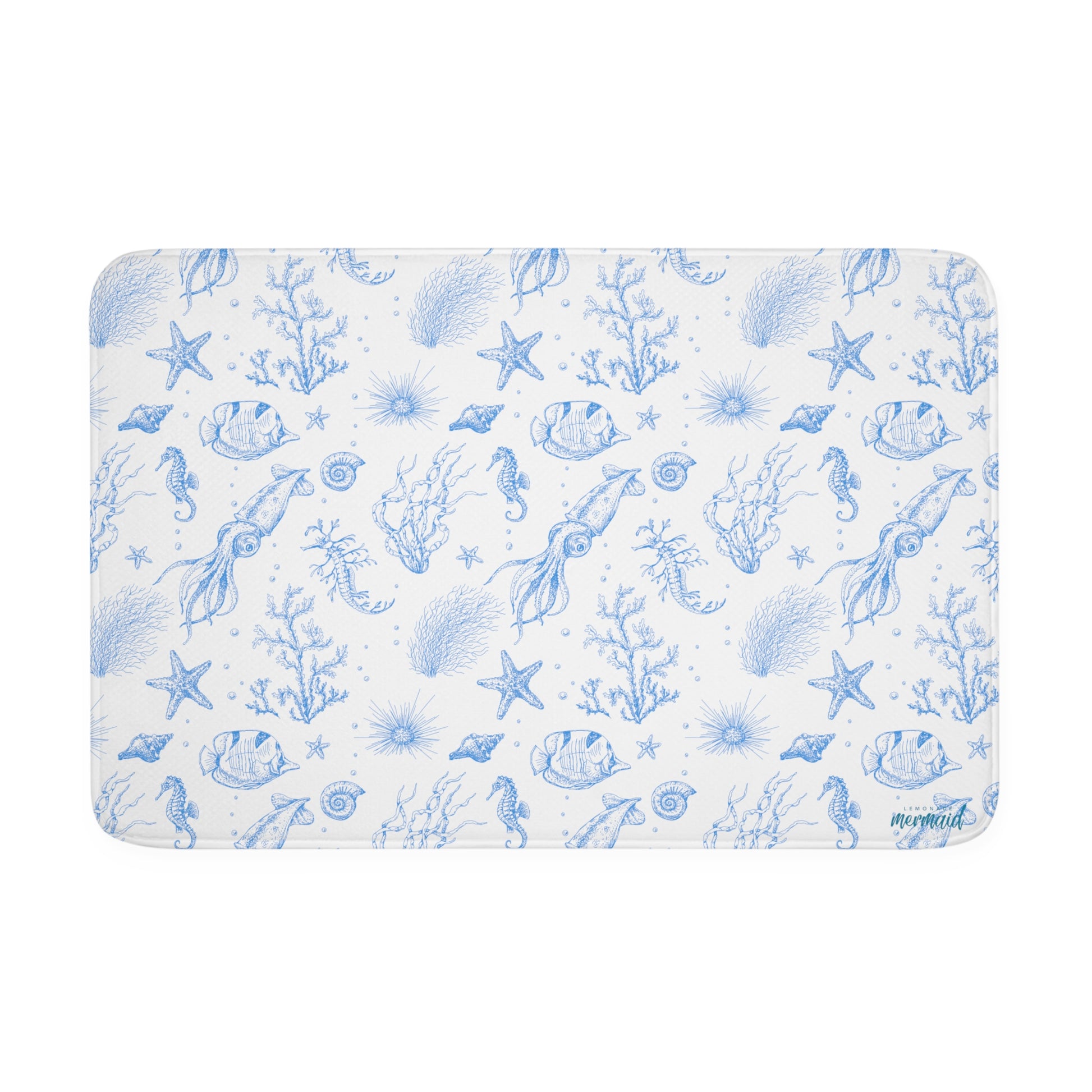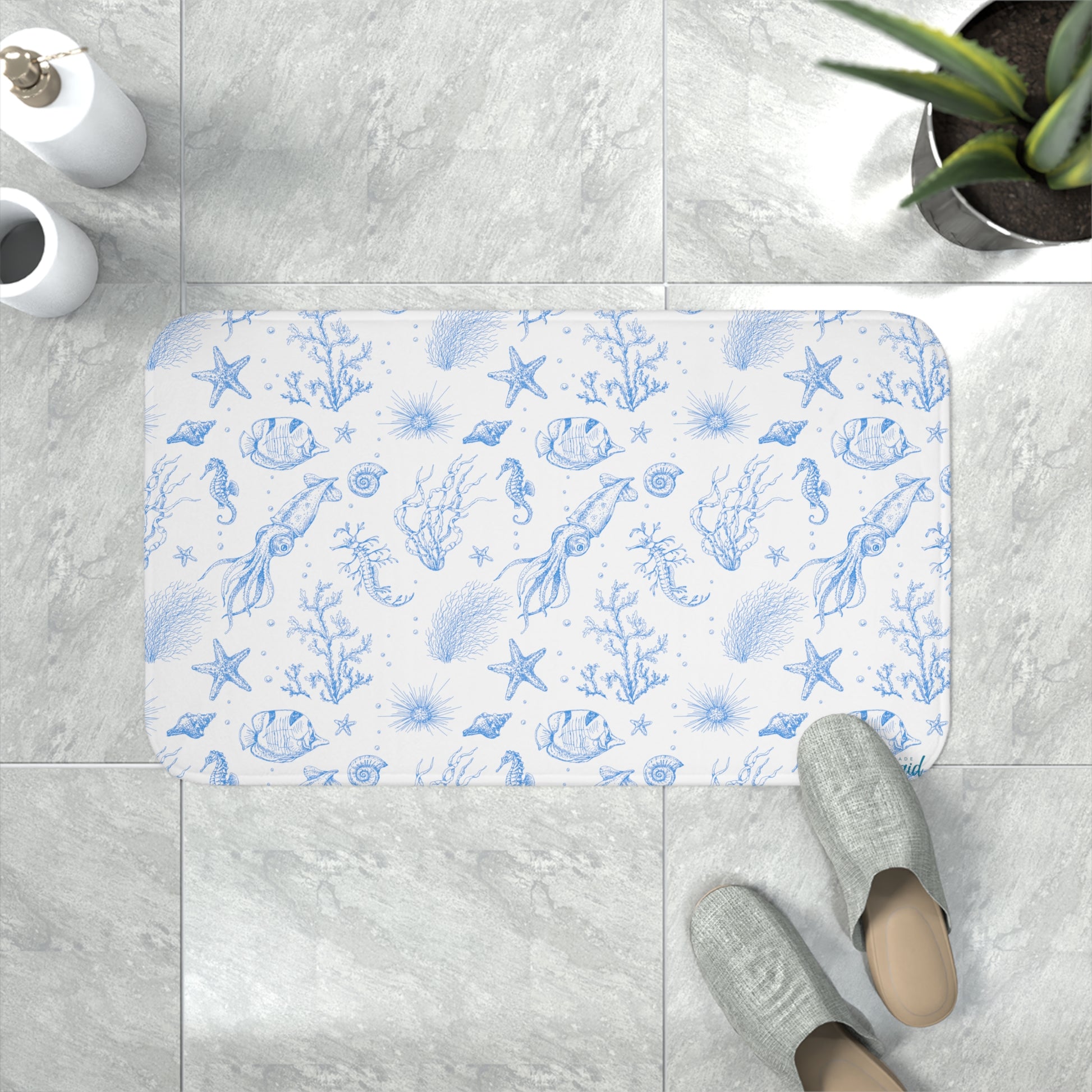 Step out of your bath or shower onto this skid-proof, pillowy-soft bath mat decorated with our "Under the Sea" critters. Designed by The Lemonade Mermaid, inspired by the blues and whites of Santorini. Featuring squid, coral, starfish, seahorses, angelfish, urchins and more!