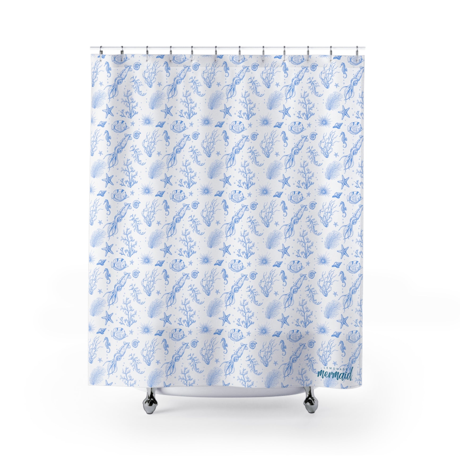 Surround yourself in the shower with our adorable "Under the Sea" creatures! Sturdy and stylish shower curtain designed by The Lemonade Mermaid, inspired by the blues and whites of Santorini. Featuring squid, coral, starfish, seahorses, angelfish, urchins and more!